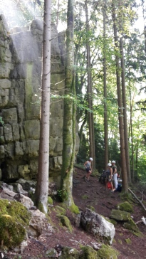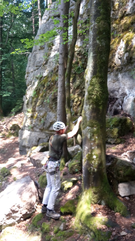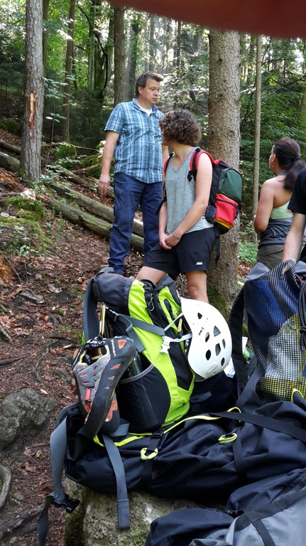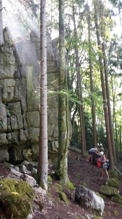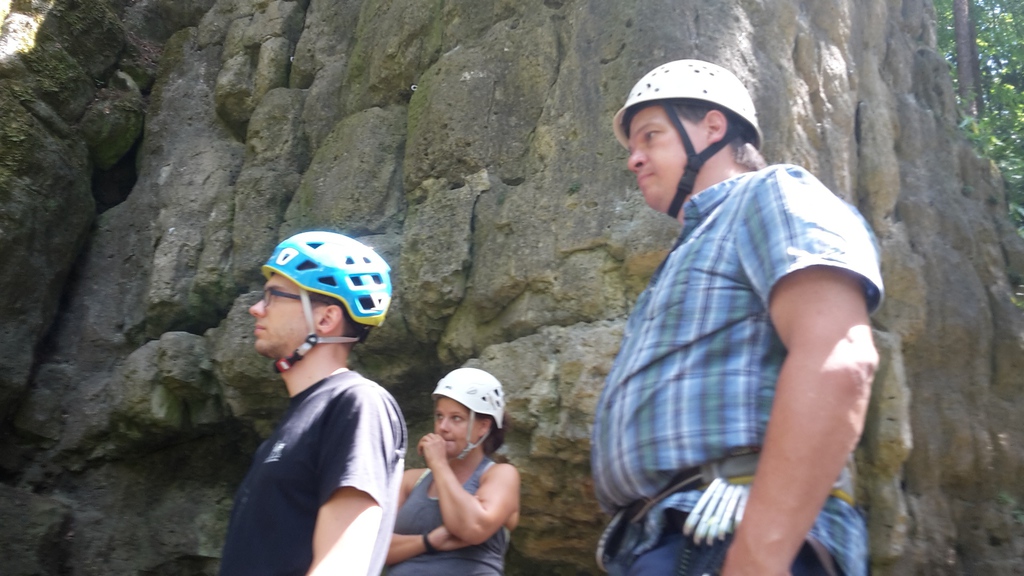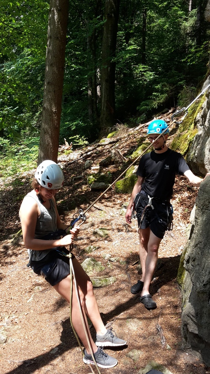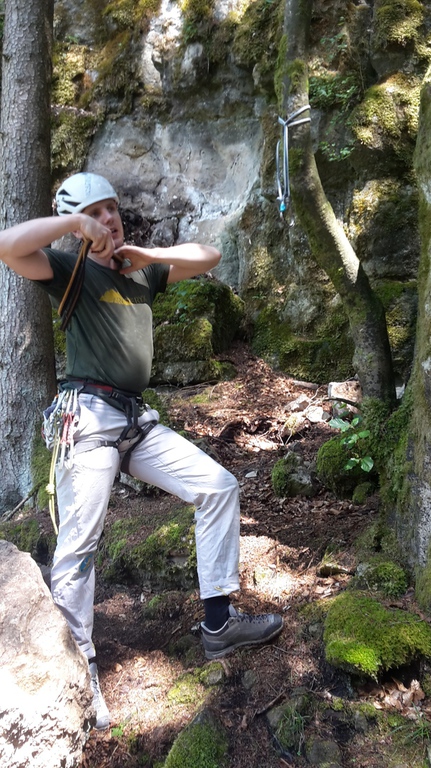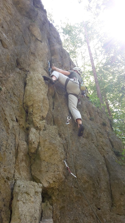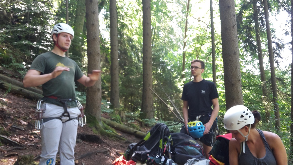 „Es macht einen großen Unterschied aus, ob man nun in der Halle oder am Fels klettert…“, das durften wir am eigenen Leib erfahren. Auch deswegen bietet der DAV Neumarkt den Kurs „von der Halle an den Fels“ an, exzellent durchgeführt von Leo Kleine. „In der Halle ist immer eine andere „Farbe“ in der Nähe, die man als Tritt oder mit der Hand benutzen kann. Anders am Felsen, hier gilt es seinen Weg selbst zu finden“. Auch gibt es zusätzlich ökologische Aspekte zu beachten, wie die sensible Felsvegetation, Sperrungen wegen Vogelschutz, Respekt vor der Pflanzen- und Tierwelt und das Verhalten während des Aufenthaltes im Klettergebiet (Müll, Lärm, Parken, Miteinander am Fels, usw.). Während einer Regenpause am Samstagnachmittag wurde uns das umweltbewusste Klettern von Leo ausführlich erklärt und nahe gebracht. Wenn es nicht geregnet hat, wurden die bekannten Grundlagen vom Klettern in der Halle (richtiges Sichern, Einbinden ins Seil, Partnercheck, Seilkommandos usw.) anfangs wiederholt und konnten beim ersten Klettern am leichteren Fels nochmals geübt werden. Schwerpunkte im Kletterkurs (erster Tag Klettergebiet Weiße Wand Südseite auf der Hersbrucker Alb, zweiter Tag Dachlwand Lauterachtal, ca. 1,5 km von Kastl Richtung Schmidmühlen) waren Routenbeurteilung und Partnercheck, Vorstieg sichern und klettern, richtiges Einhängen der Expressschlingen, richtiges Fädeln und Abbauen, Abbauen mit Abseilen, Seilkommandos und die ökologischen Aspekte. Nach ausführlichem Üben am Boden der verschiedenen Techniken konnten wir fünf Kursteilnehmer alles Erlernte am Fels ausgiebig üben und am Ende des Kurses auch den Kletterschein Outdoor des DAV in Empfang nehmen.