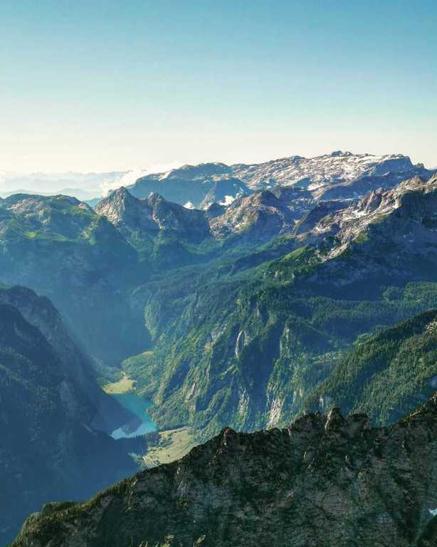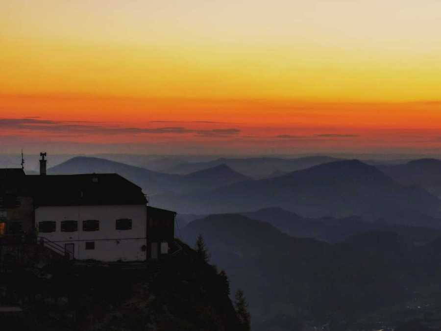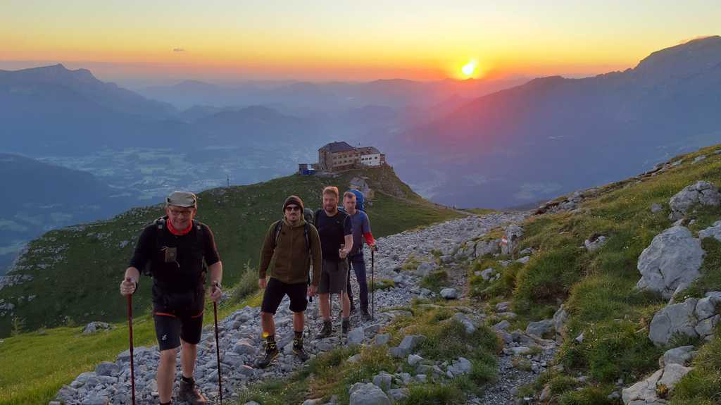 Souvenir-Häuschen rechts liegen gelassen und den AV Weg 442 und AV Weg 441 vorbei an der Stubenalm und Mitterkaseralm in 3 gemütlichen Stunden (ca. 1285 Hm; 6,9 km) zum Watzmannhaus auf 1930m. Beim Aufstieg schöne Ausblicke auf die Watzmann-Frau und die umliegenden Berge. Durch die Corona-Vorschriften mussten die Übernachtungen im Voraus gebucht sein, ebenso ist die Mitnahme eines Schlafsackes, Bett- und Kissenbezug, Maske usw. Pflicht. Das macht den Rucksack dann doch etwas schwerer. Quartierbezug, Abendessen, Vorbesprechung für die anstehende Tour und noch die ein oder andere Maß getrunken. Hüttenruhe um 22 Uhr, was so auch ganz gut war, da der Wecker am Sonntag bereits um 4.30 Uhr klingelte.