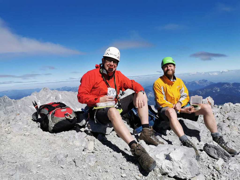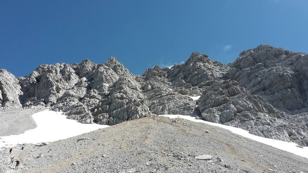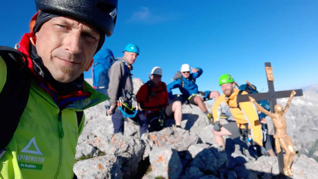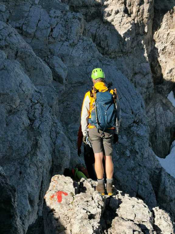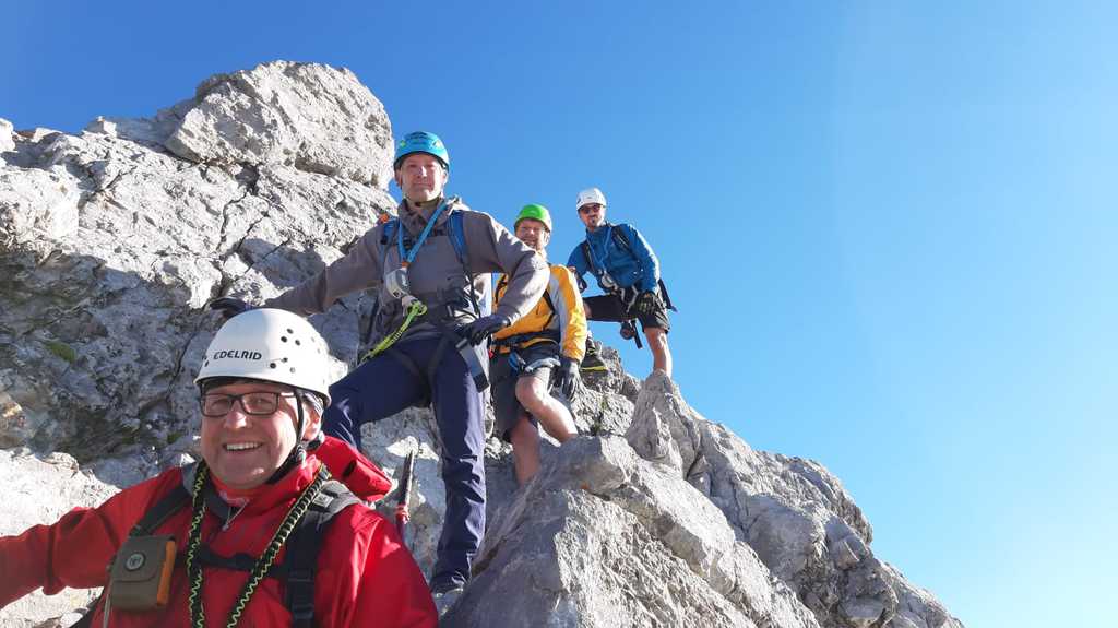 Der Weg zur Mittelspitze (2713m; ca. 8 Uhr) führt gleich am Notbiwak vorbei und hat bei uns eine Stunde gedauert. Schöne Wanderung bzw. Kletterei am Grat (relativ viel versichert, das ist aber immer Ansichtssache!!). Knapp zwei weitere Stunden später haben wir die Südspitze erklommen. (2712m; 10 Uhr). Dort Brotzeit gemacht, die Aussicht genossen, ausreichend Bilder geschossen und uns auf den langen Abstieg (mental) vorbereitet. (10.30 Uhr)