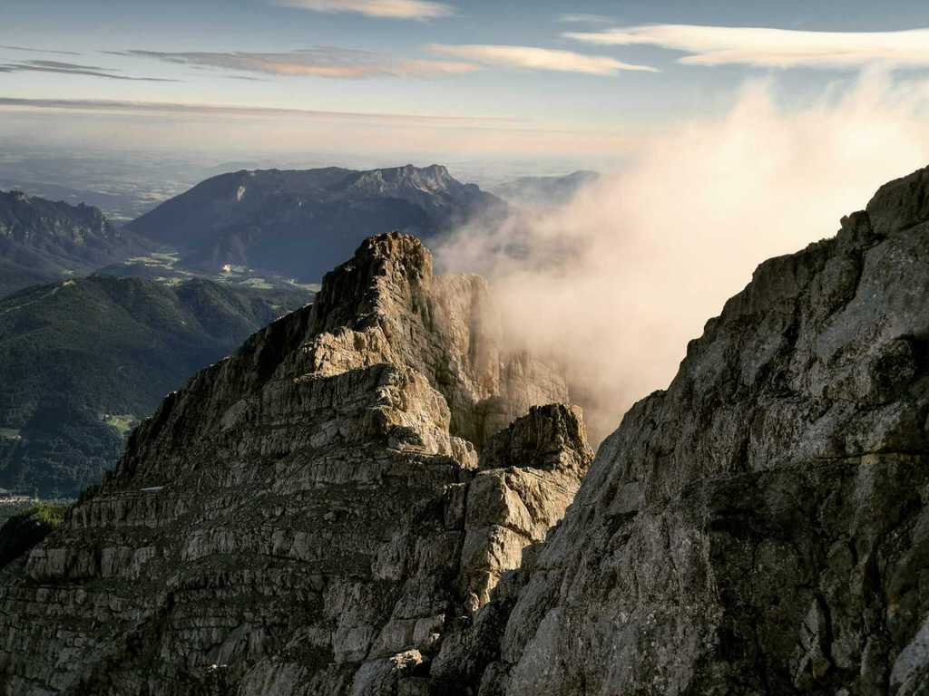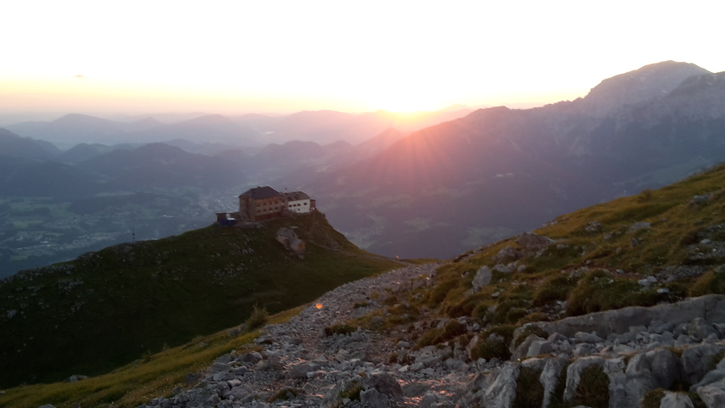 Um eher als die „Frühstücker“ (gibt’s ab 6 Uhr) unterwegs zu sein, Lunchpaket (wer will am Abend vorher bestellen) eingepackt und los gings um 5 Uhr hinauf aufs Hocheck. Superschönen Sonnenaufgang miterlebt und die Ruhe beim Aufstieg genossen. 740Hm und zwei Stunden später haben wir das Hocheck (2651m) erklommen, die Aussicht genossen, verschnauft und unsere Ausrüstung für die Watzmannüberschreitung angelegt (Helm, Klettergurt, Klettersteig-Set). (7 Uhr)
